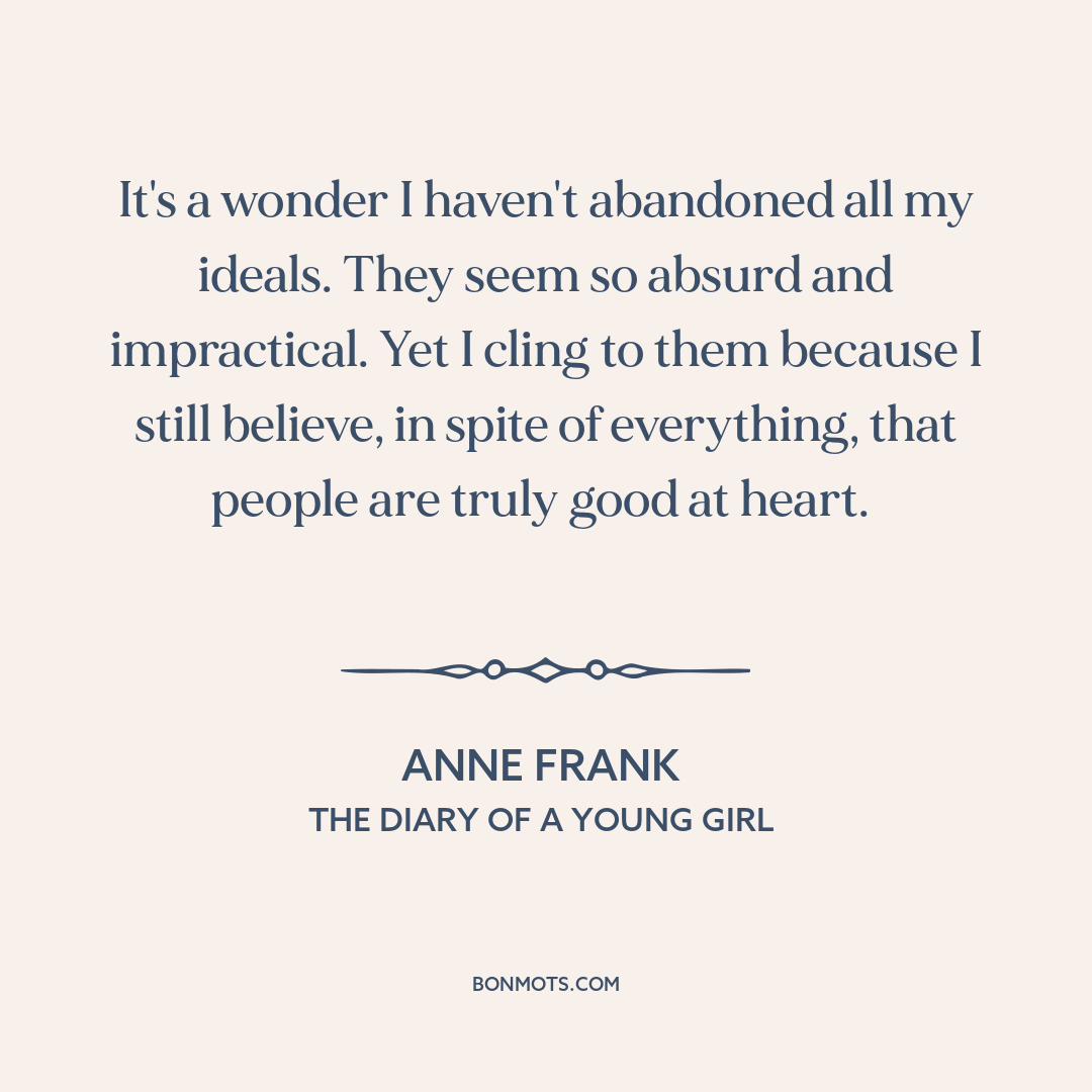 It's a wonder I haven't abandoned all my ideals. They seem so absurd and impractical. Yet I cling to them because I still believe, in spite of everything, that people are truly good at heart.