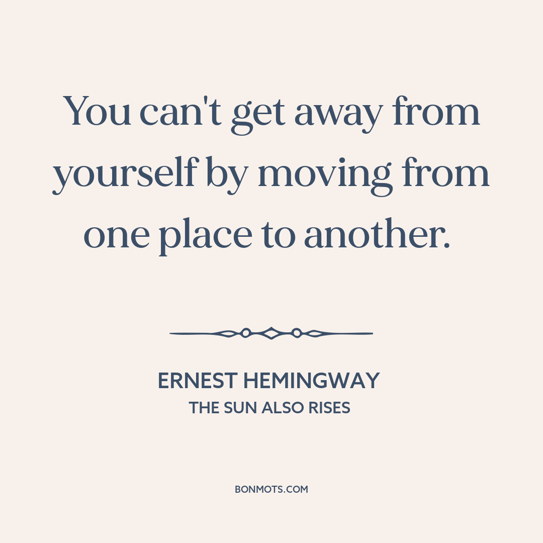 You can't get away from yourself by moving from one place to another. Ernest Hemingway The Sun Also Rises Buy The Sun Also Rises at Amazon Buy The Sun Also Rises at Amazon Read The Sun Also Rises at Project Gutenberg Instagram sharing coming soon. Quote text and source copied to clipboard. Link to this quote copied to clipboard. More information about this quote Topic Running away Facing oneself Speaker Jake Barnes Author Ernest Hemingway Source The Sun Also Rises Medium Novel Language English Time 1926 1920s 20th century Occupation Novelist Writer From United States Authentication Score 3 More information on Authentication Score coming soon. Citation Hemingway, Ernest. The Sun Also Rises. Charles Scribner's Sons, 1926, bk. 1, ch. 2. Citation text copied to clipboard.
