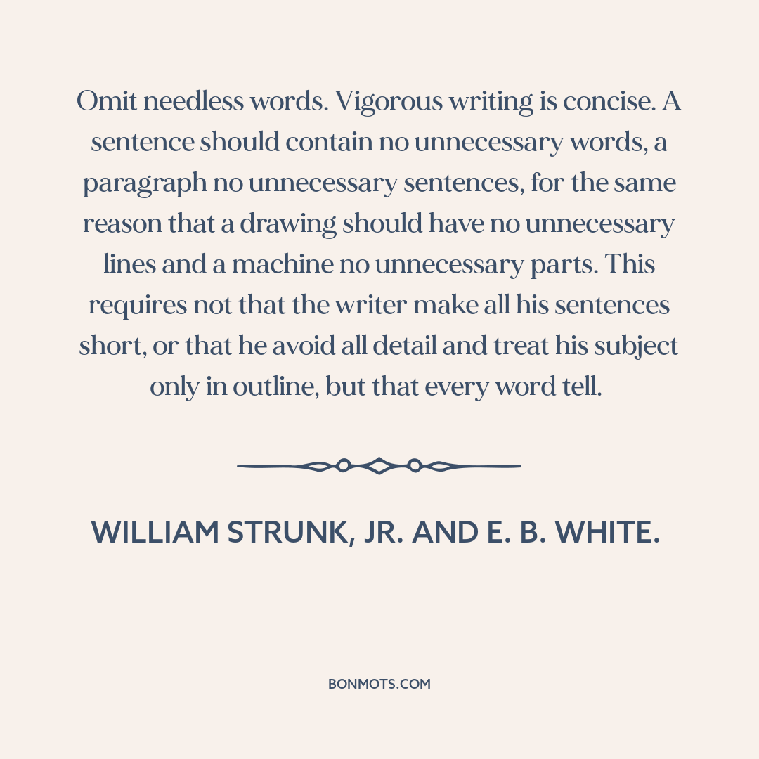 Omit needless words. Vigorous writing is concise. A sentence should contain no unnecessary words, a paragraph no unnecessary sentences, for the same reason that a drawing should have no unnecessary lines and a machine no unnecessary parts. This requires not that the writer make all his sentences short, or that he avoid all detail and treat his subject only in outline, but that every word tell.