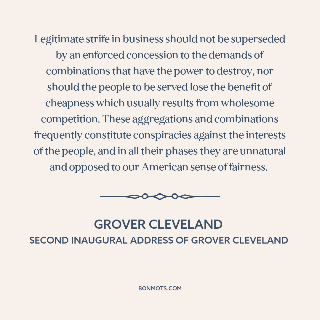 Legitimate strife in business should not be superseded by an enforced concession to the demands of combinations that have the power to destroy, nor should the people to be served lose the benefit of cheapness which usually results from wholesome competition. These aggregations and combinations frequently constitute conspiracies against the interests of the people, and in all their phases they are unnatural and opposed to our American sense of fairness.