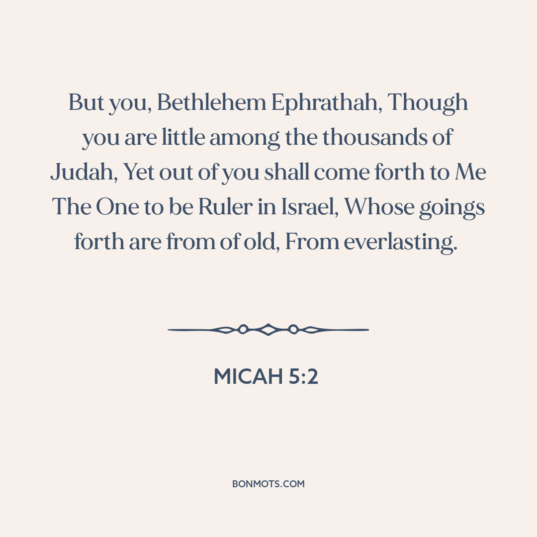 But you, Bethlehem Ephrathah, Though you are little among the thousands of Judah, Yet out of you shall come forth to Me The One to be Ruler in Israel, Whose goings forth are from of old, From everlasting.
