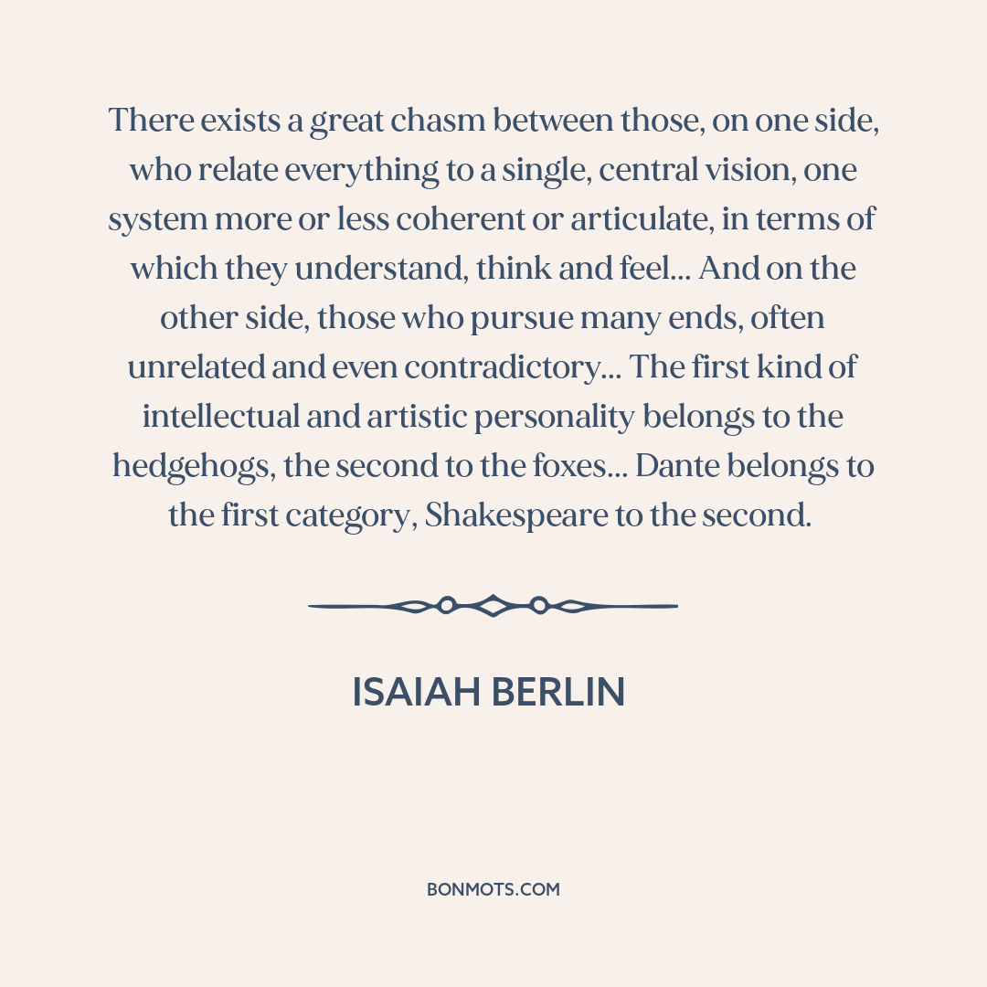 There exists a great chasm between those, on one side, who relate everything to a single, central vision, one system more or less coherent or articulate, in terms of which they understand, think and feel... And on the other side, those who pursue many ends, often unrelated and even contradictory... The first kind of intellectual and artistic personality belongs to the hedgehogs, the second to the foxes... Dante belongs to the first category, Shakespeare to the second.