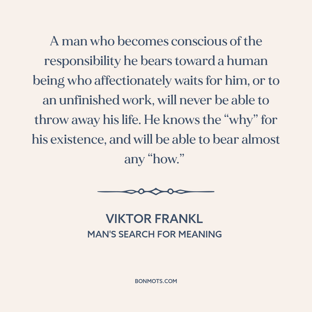 A man who becomes conscious of the responsibility he bears toward a human being who affectionately waits for him, or to an unfinished work, will never be able to throw away his life. He knows the “why” for his existence, and will be able to bear almost any “how.”
