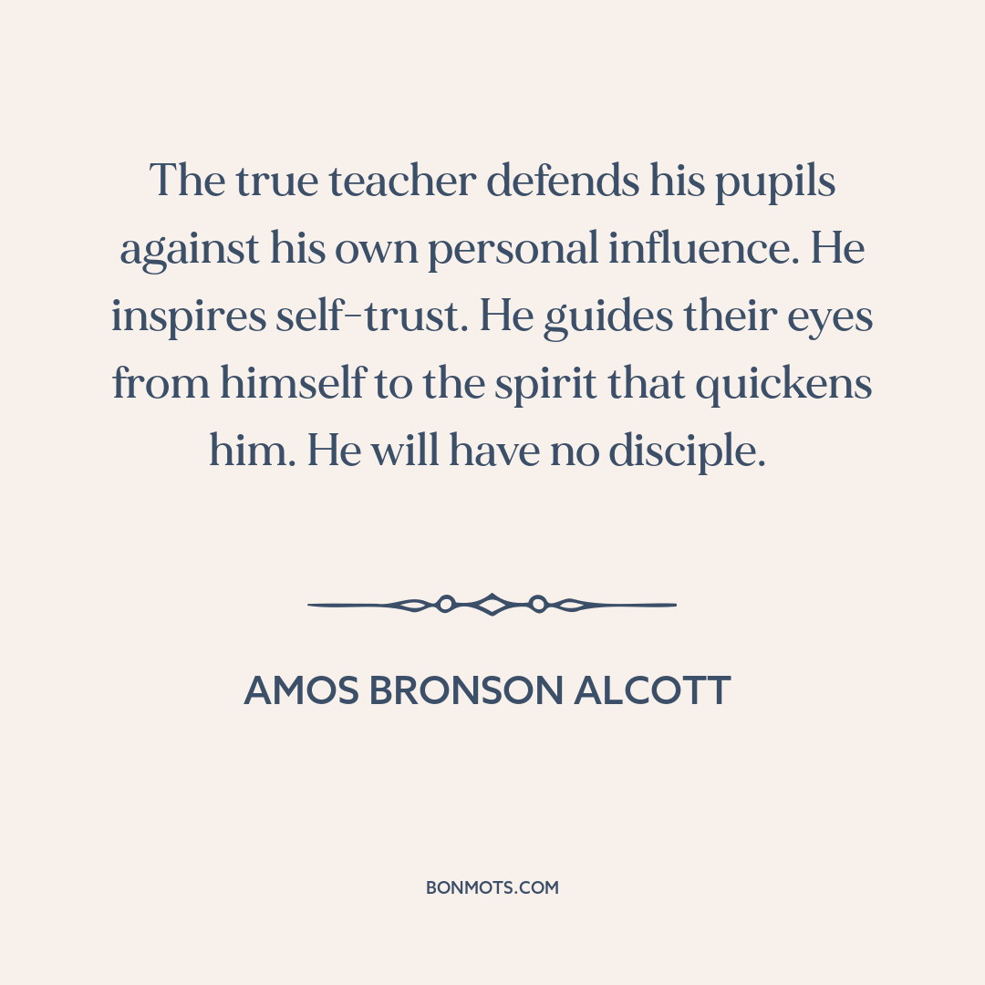 The true teacher defends his pupils against his own personal influence. He inspires self-trust. He guides their eyes from himself to the spirit that quickens him. He will have no disciple.