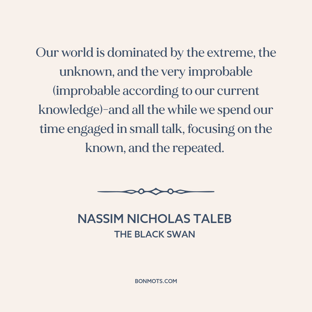 Our world is dominated by the extreme, the unknown, and the very improbable (improbable according to our current knowledge)-and all the while we spend our time engaged in small talk, focusing on the known, and the repeated.