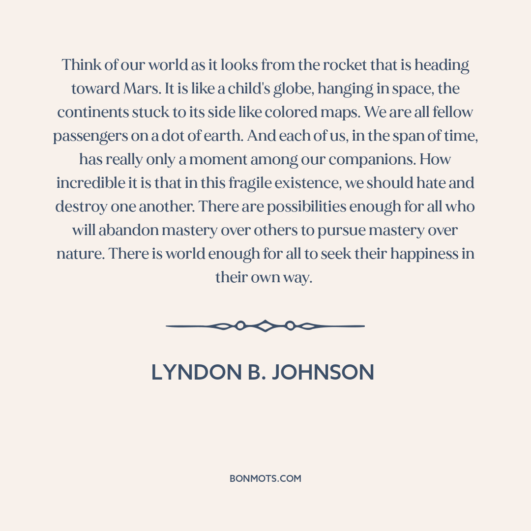 Think of our world as it looks from the rocket that is heading toward Mars. It is like a child's globe, hanging in space, the continents stuck to its side like colored maps. We are all fellow passengers on a dot of earth. And each of us, in the span of time, has really only a moment among our companions. How incredible it is that in this fragile existence, we should hate and destroy one another. There are possibilities enough for all who will abandon mastery over others to pursue mastery over nature. There is world enough for all to seek their happiness in their own way.