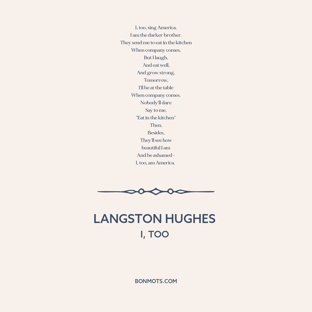 Hughes, Langston. "I, Too." The Weary Blues. Alfred A. Knopf, 1926, I. 1.
