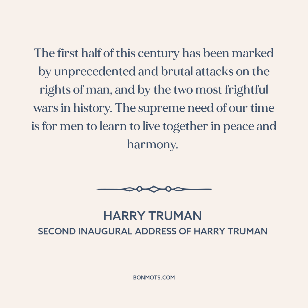 The first half of this century has been marked by unprecedented and brutal attacks on the rights of man, and by the two most frightful wars in history. The supreme need of our time is for men to learn to live together in peace and harmony.