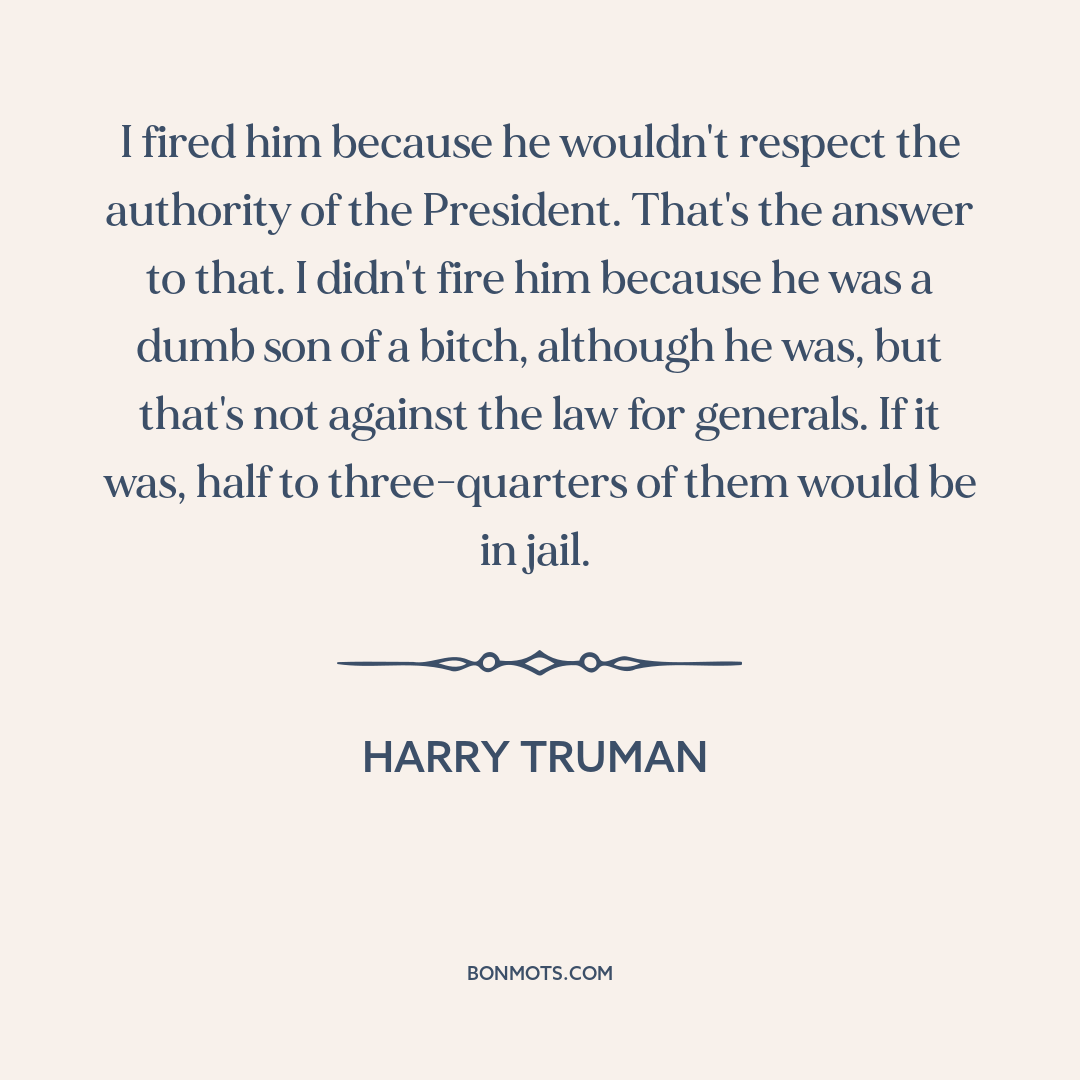 I fired him because he wouldn't respect the authority of the President. That's the answer to that. I didn't fire him because he was a dumb son of a bitch, although he was, but that's not against the law for generals. If it was, half to three-quarters of them would be in jail.
