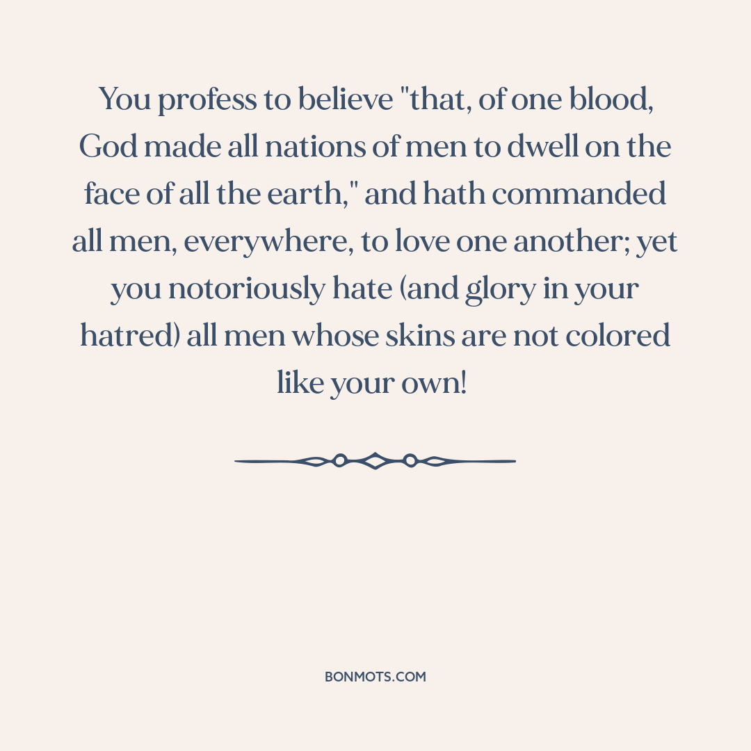 You profess to believe "that, of one blood, God made all nations of men to dwell on the face of all the earth," and hath commanded all men, everywhere, to love one another; yet you notoriously hate (and glory in your hatred) all men whose skins are not colored like your own!