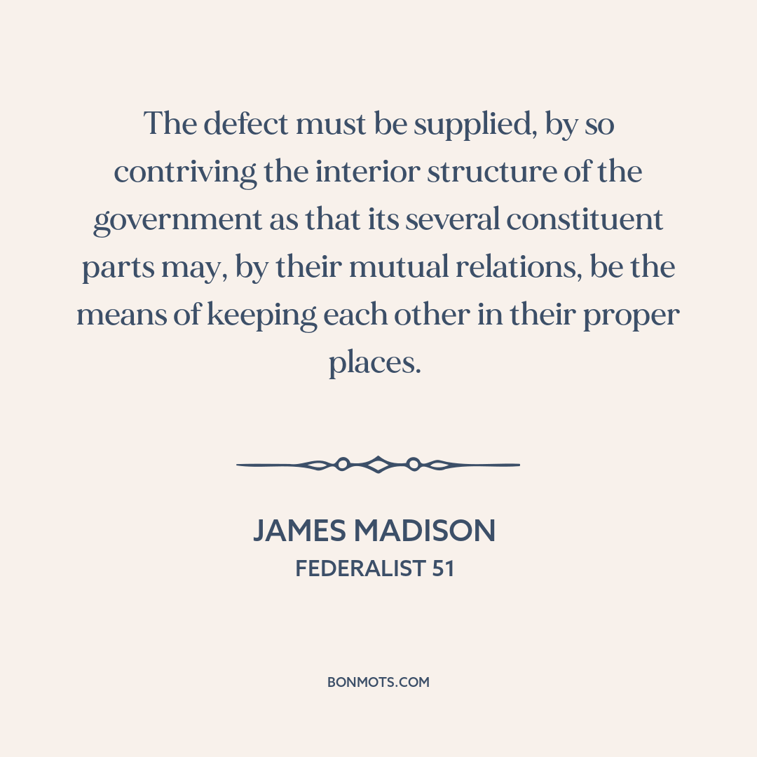 The defect must be supplied, by so contriving the interior structure of the government as that its several constituent parts may, by their mutual relations, be the means of keeping each other in their proper places.