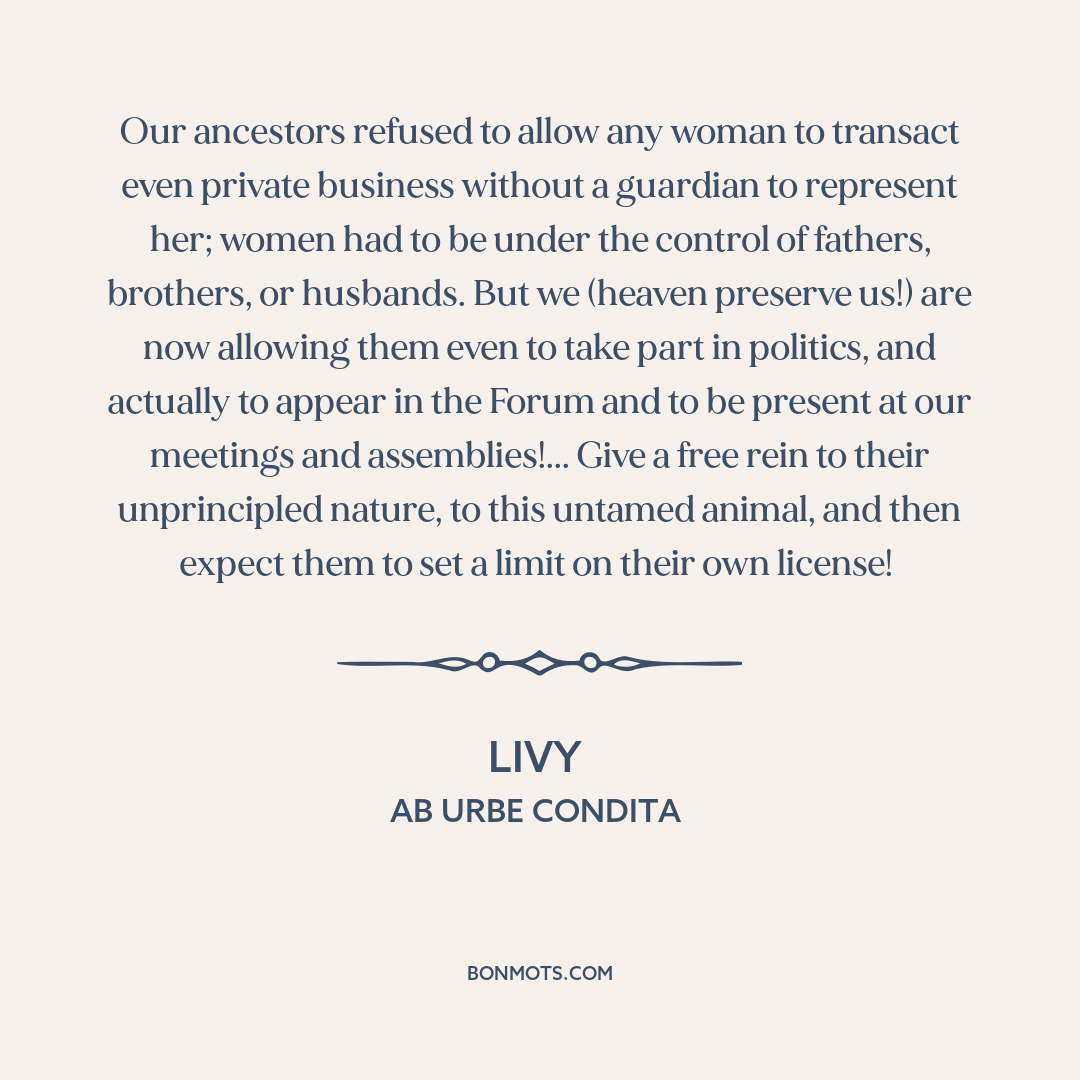 Our ancestors refused to allow any woman to transact even private business without a guardian to represent her; women had to be under the control of fathers, brothers, or husbands. But we (heaven preserve us!) are now allowing them even to take part in politics, and actually to appear in the Forum and to be present at our meetings and assemblies!... Give a free rein to their unprincipled nature, to this untamed animal, and then expect them to set a limit on their own license!
