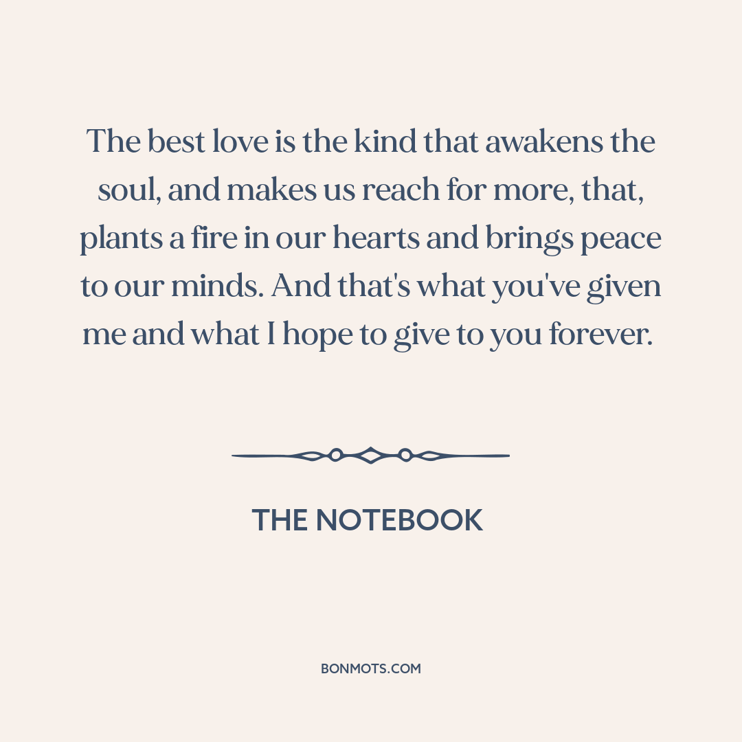 The best love is the kind that awakens the soul, and makes us reach for more, that, plants a fire in our hearts and brings peace to our minds. And that's what you've given me and what I hope to give to you forever.