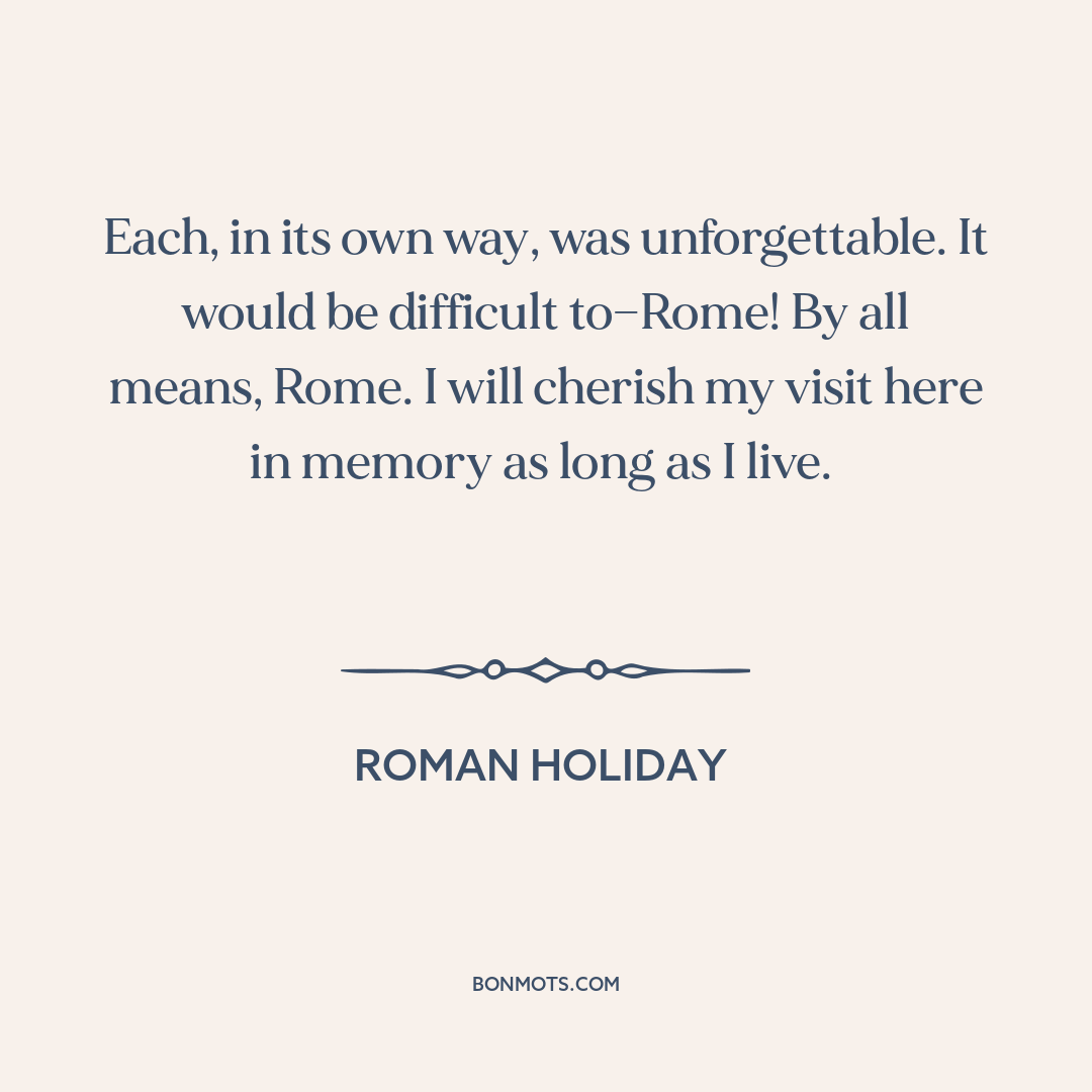 Each, in its own way, was unforgettable. It would be difficult to—Rome! By all means, Rome. I will cherish my visit here in memory as long as I live.