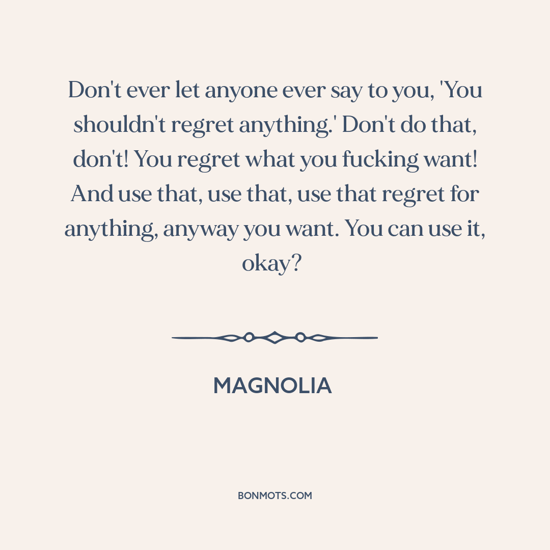 Don't ever let anyone ever say to you, 'You shouldn't regret anything.' Don't do that, don't! You regret what you fucking want! And use that, use that, use that regret for anything, anyway you want. You can use it, okay?