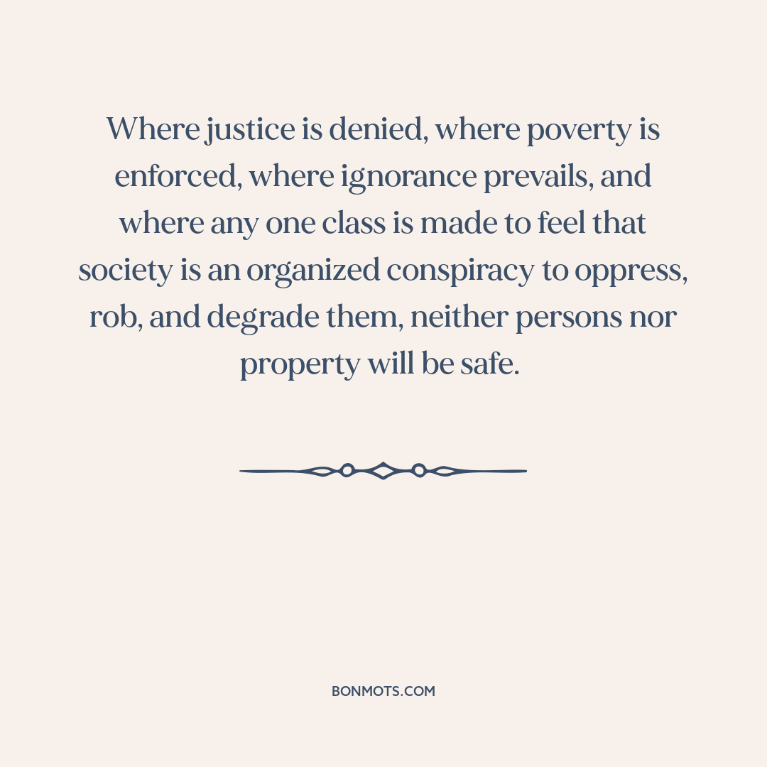 Where justice is denied, where poverty is enforced, where ignorance prevails, and where any one class is made to feel that society is an organized conspiracy to oppress, rob, and degrade them, neither persons nor property will be safe.