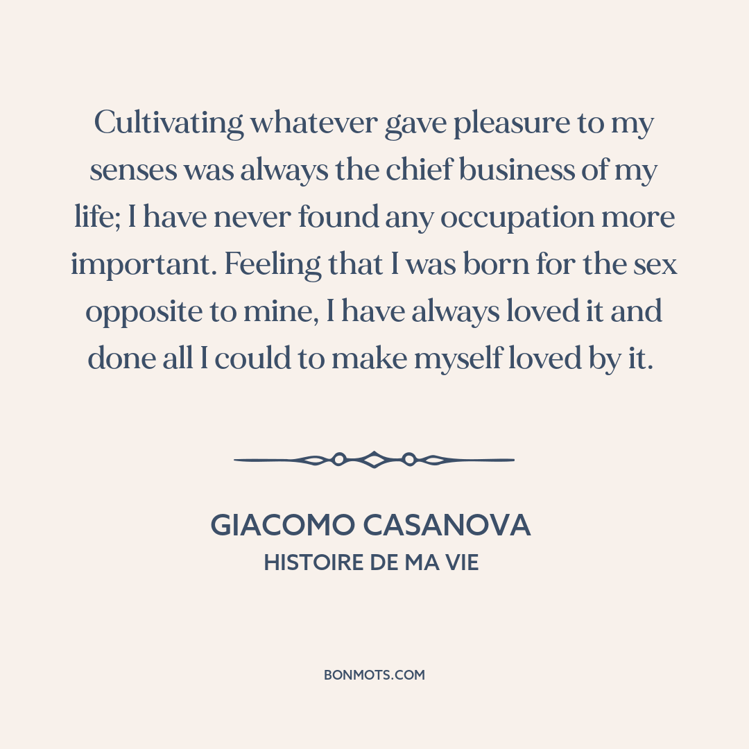 Cultivating whatever gave pleasure to my senses was always the chief business of my life; I have never found any occupation more important. Feeling that I was born for the sex opposite to mine, I have always loved it and done all I could to make myself loved by it.