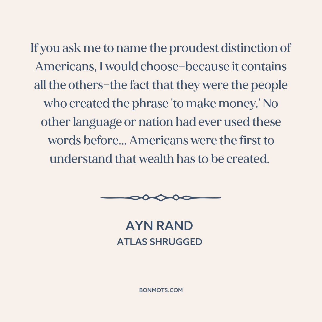 If you ask me to name the proudest distinction of Americans, I would choose—because it contains all the others—the fact that they were the people who created the phrase 'to make money.' No other language or nation had ever used these words before... Americans were the first to understand that wealth has to be created.