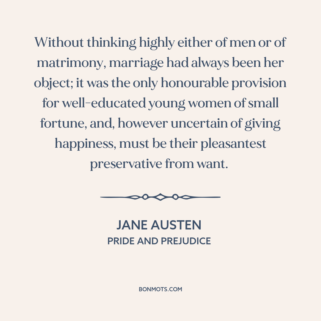 Without thinking highly either of men or of matrimony, marriage had always been her object; it was the only honourable provision for well-educated young women of small fortune, and, however uncertain of giving happiness, must be their pleasantest preservative from want.
