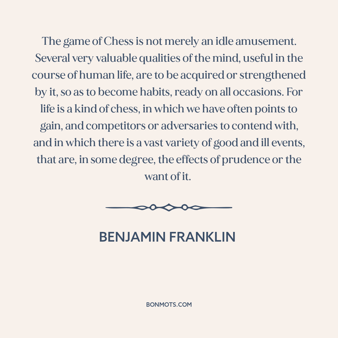 The game of Chess is not merely an idle amusement. Several very valuable qualities of the mind, useful in the course of human life, are to be acquired or strengthened by it, so as to become habits, ready on all occasions. For life is a kind of chess, in which we have often points to gain, and competitors or adversaries to contend with, and in which there is a vast variety of good and ill events, that are, in some degree, the effects of prudence or the want of it.