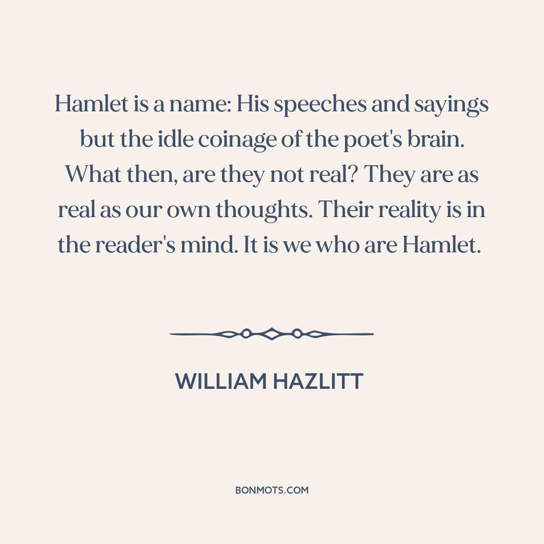 Hamlet is a name: His speeches and sayings but the idle coinage of the poet's brain. What then, are they not real? They are as real as our own thoughts. Their reality is in the reader's mind. It is we who are Hamlet.