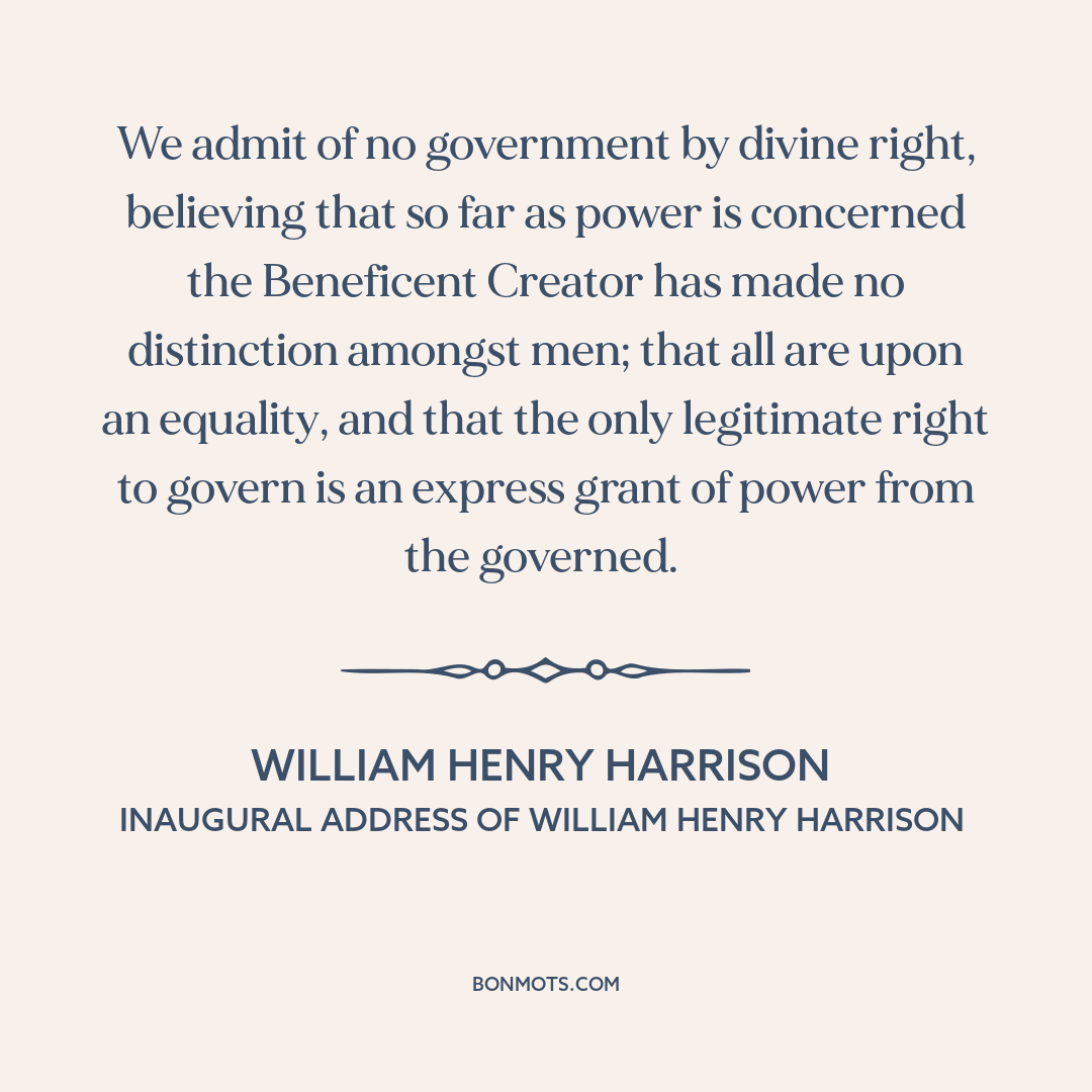 We admit of no government by divine right, believing that so far as power is concerned the Beneficent Creator has made no distinction amongst men; that all are upon an equality, and that the only legitimate right to govern is an express grant of power from the governed.