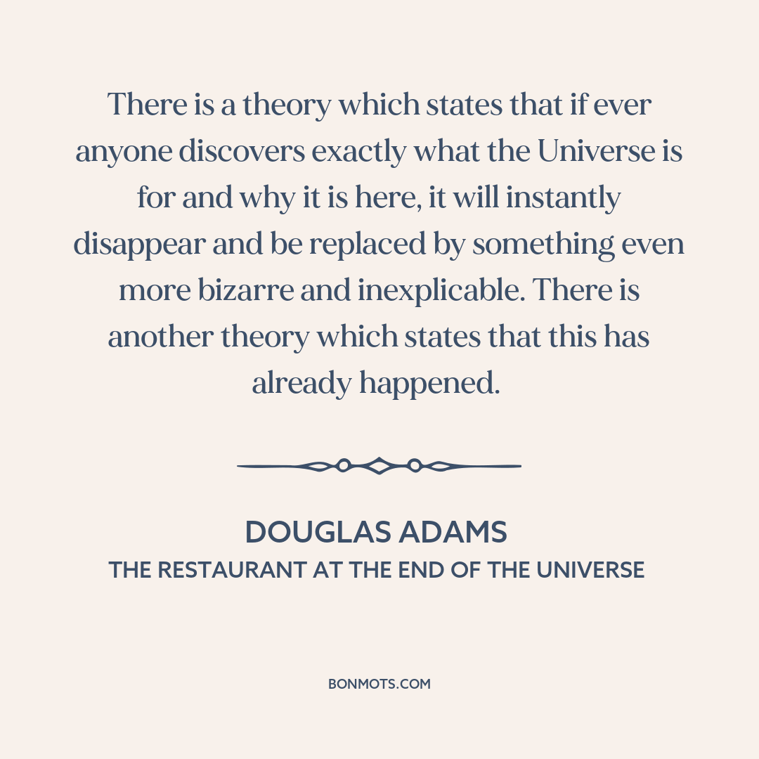 There is a theory which states that if ever anyone discovers exactly what the Universe is for and why it is here, it will instantly disappear and be replaced by something even more bizarre and inexplicable. There is another theory which states that this has already happened.