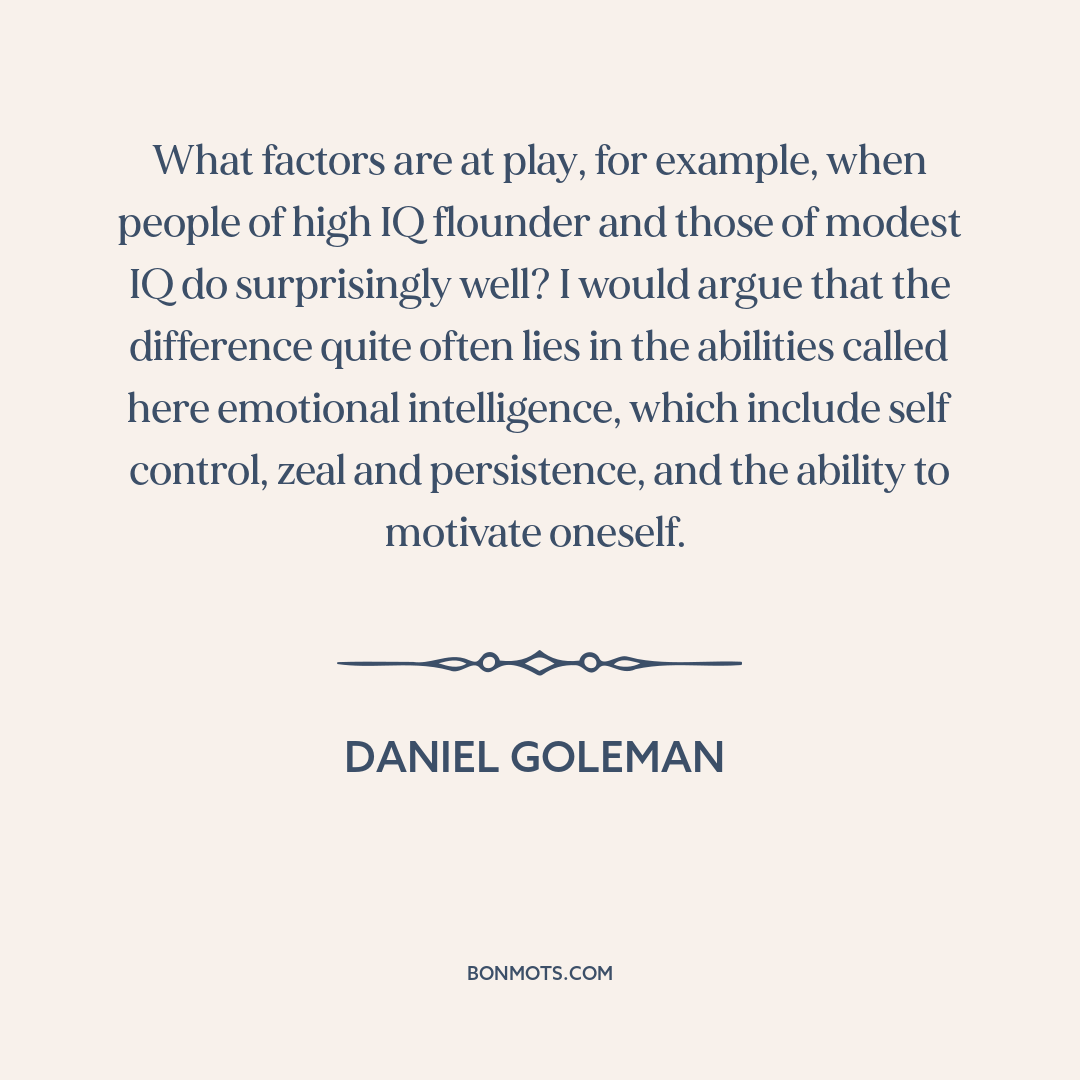 What factors are at play, for example, when people of high IQ flounder and those of modest IQ do surprisingly well? I would argue that the difference quite often lies in the abilities called here emotional intelligence, which include self control, zeal and persistence, and the ability to motivate oneself.