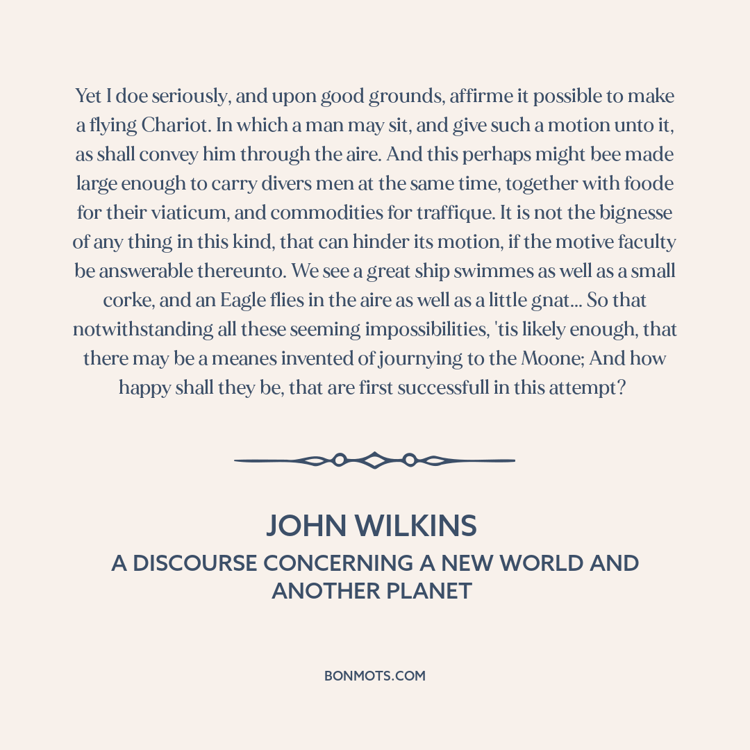 Yet I doe seriously, and upon good grounds, affirme it possible to make a flying Chariot. In which a man may sit, and give such a motion unto it, as shall convey him through the aire. And this perhaps might bee made large enough to carry divers men at the same time, together with foode for their viaticum, and commodities for traffique. It is not the bignesse of any thing in this kind, that can hinder its motion, if the motive faculty be answerable thereunto. We see a great ship swimmes as well as a small corke, and an Eagle flies in the aire as well as a little gnat... So that notwithstanding all these seeming impossibilities, 'tis likely enough, that there may be a meanes invented of journying to the Moone; And how happy shall they be, that are first successfull in this attempt?