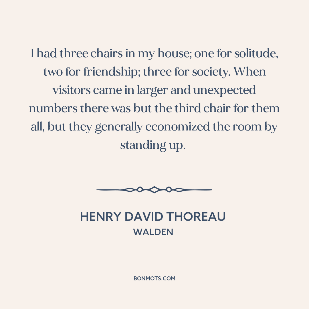 I had three chairs in my house; one for solitude, two for friendship; three for society. When visitors came in larger and unexpected numbers there was but the third chair for them all, but they generally economized the room by standing up.