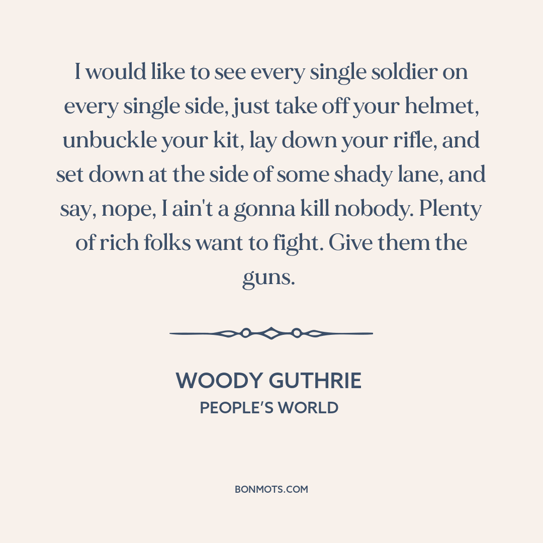 I would like to see every single soldier on every single side, just take off your helmet, unbuckle your kit, lay down your rifle, and set down at the side of some shady lane, and say, nope, I ain't a gonna kill nobody. Plenty of rich folks want to fight. Give them the guns.