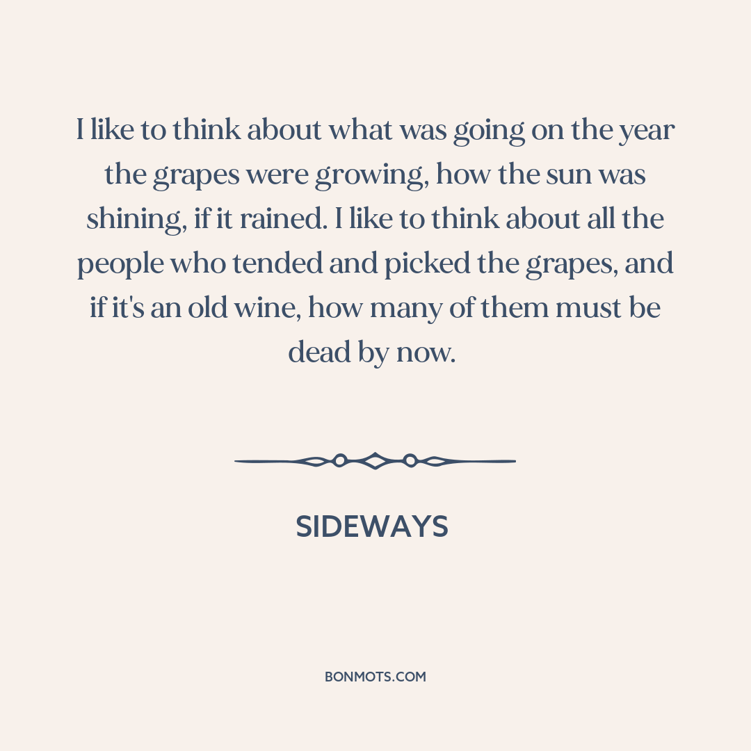 I like to think about what was going on the year the grapes were growing, how the sun was shining, if it rained. I like to think about all the people who tended and picked the grapes, and if it's an old wine, how many of them must be dead by now.