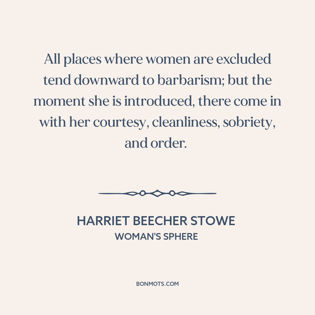 All places where women are excluded tend downward to barbarism; but the moment she is introduced, there come in with her courtesy, cleanliness, sobriety, and order.
