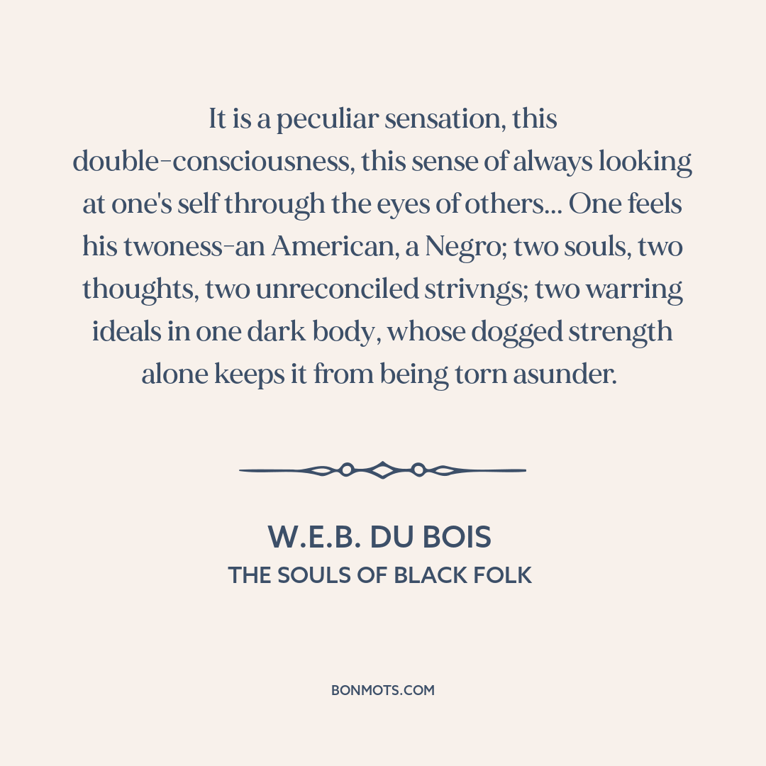 It is a peculiar sensation, this double-consciousness, this sense of always looking at one's self through the eyes of others... One feels his twoness-an American, a Negro; two souls, two thoughts, two unreconciled strivngs; two warring ideals in one dark body, whose dogged strength alone keeps it from being torn asunder.