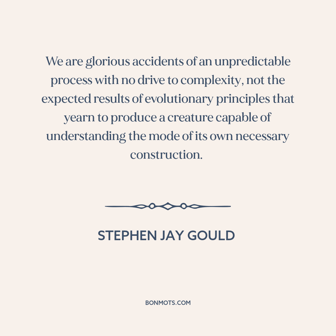 We are glorious accidents of an unpredictable process with no drive to complexity, not the expected results of evolutionary principles that yearn to produce a creature capable of understanding the mode of its own necessary construction.