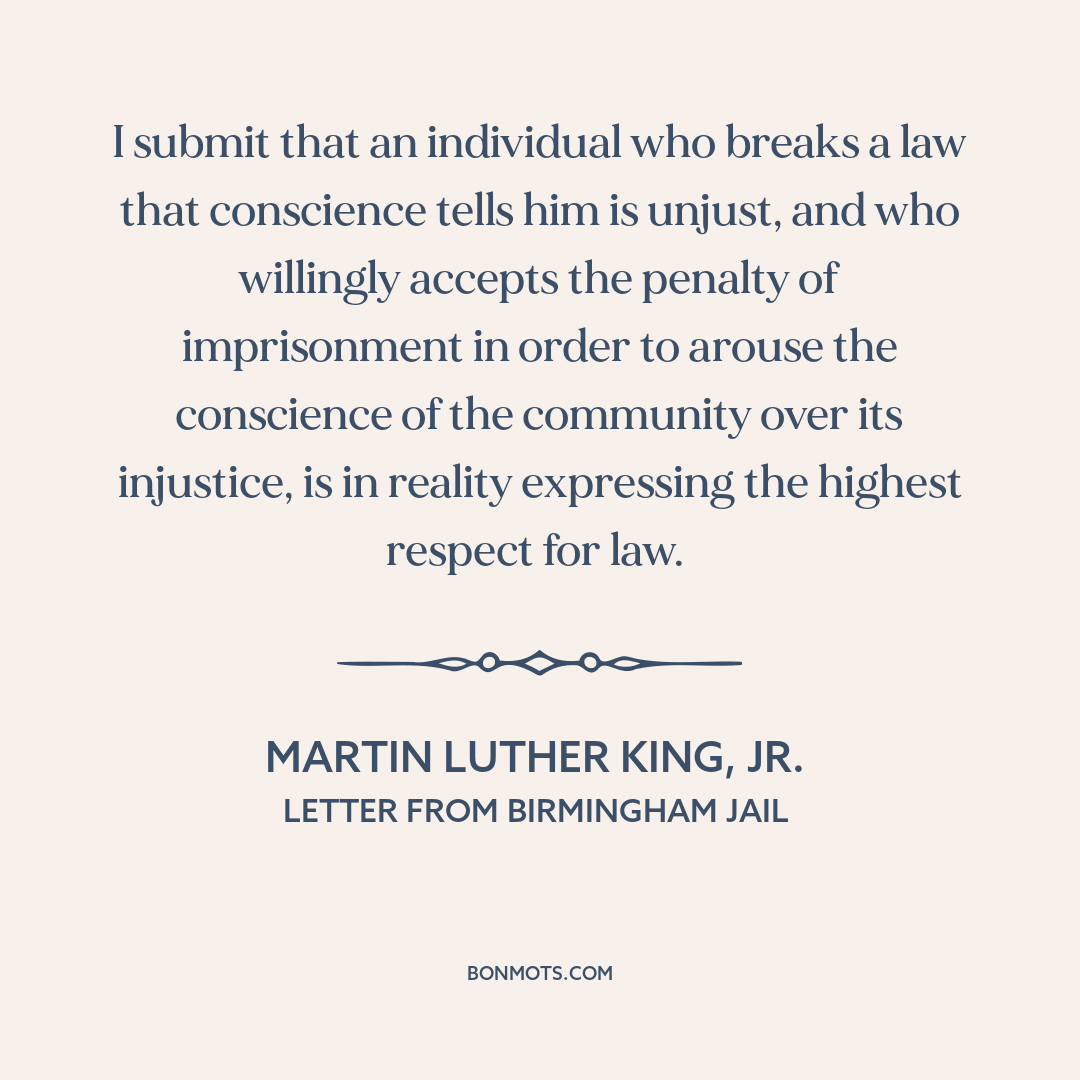 I submit that an individual who breaks a law that conscience tells him is unjust, and who willingly accepts the penalty of imprisonment in order to arouse the conscience of the community over its injustice, is in reality expressing the highest respect for law.