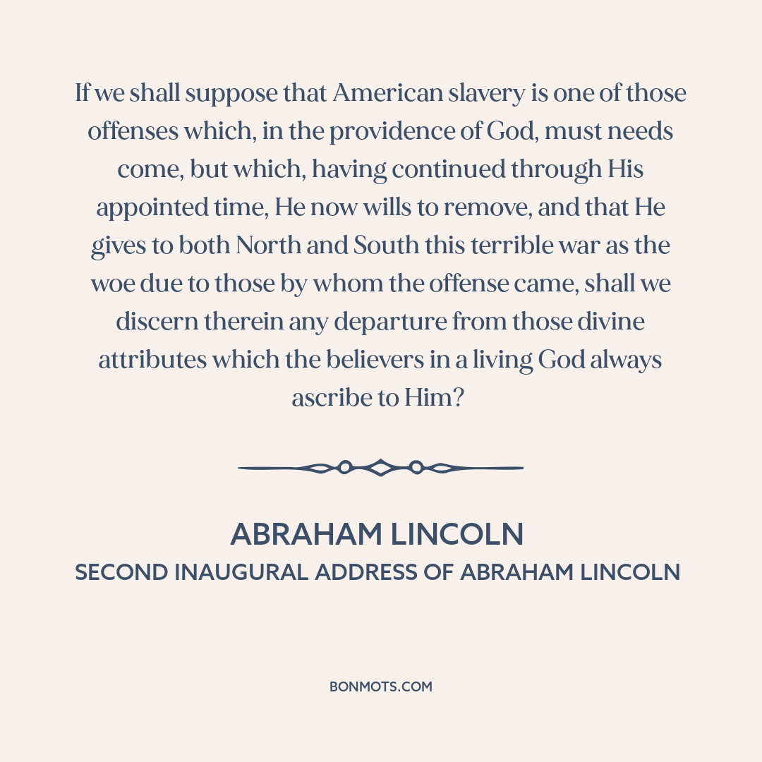 If we shall suppose that American slavery is one of those offenses which, in the providence of God, must needs come, but which, having continued through His appointed time, He now wills to remove, and that He gives to both North and South this terrible war as the woe due to those by whom the offense came, shall we discern therein any departure from those divine attributes which the believers in a living God always ascribe to Him?