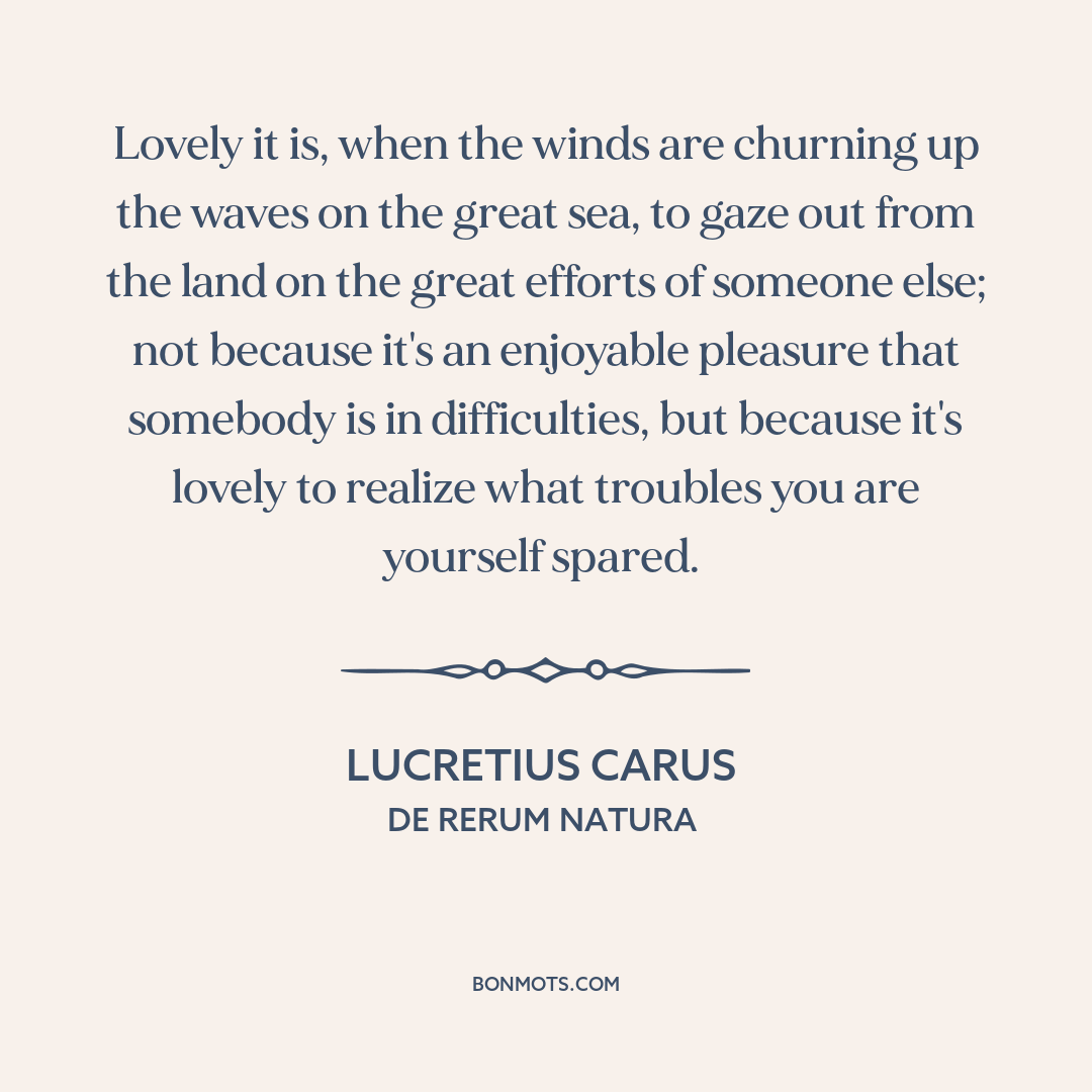Lovely it is, when the winds are churning up the waves on the great sea, to gaze out from the land on the great efforts of someone else; not because it's an enjoyable pleasure that somebody is in difficulties, but because it's lovely to realize what troubles you are yourself spared.