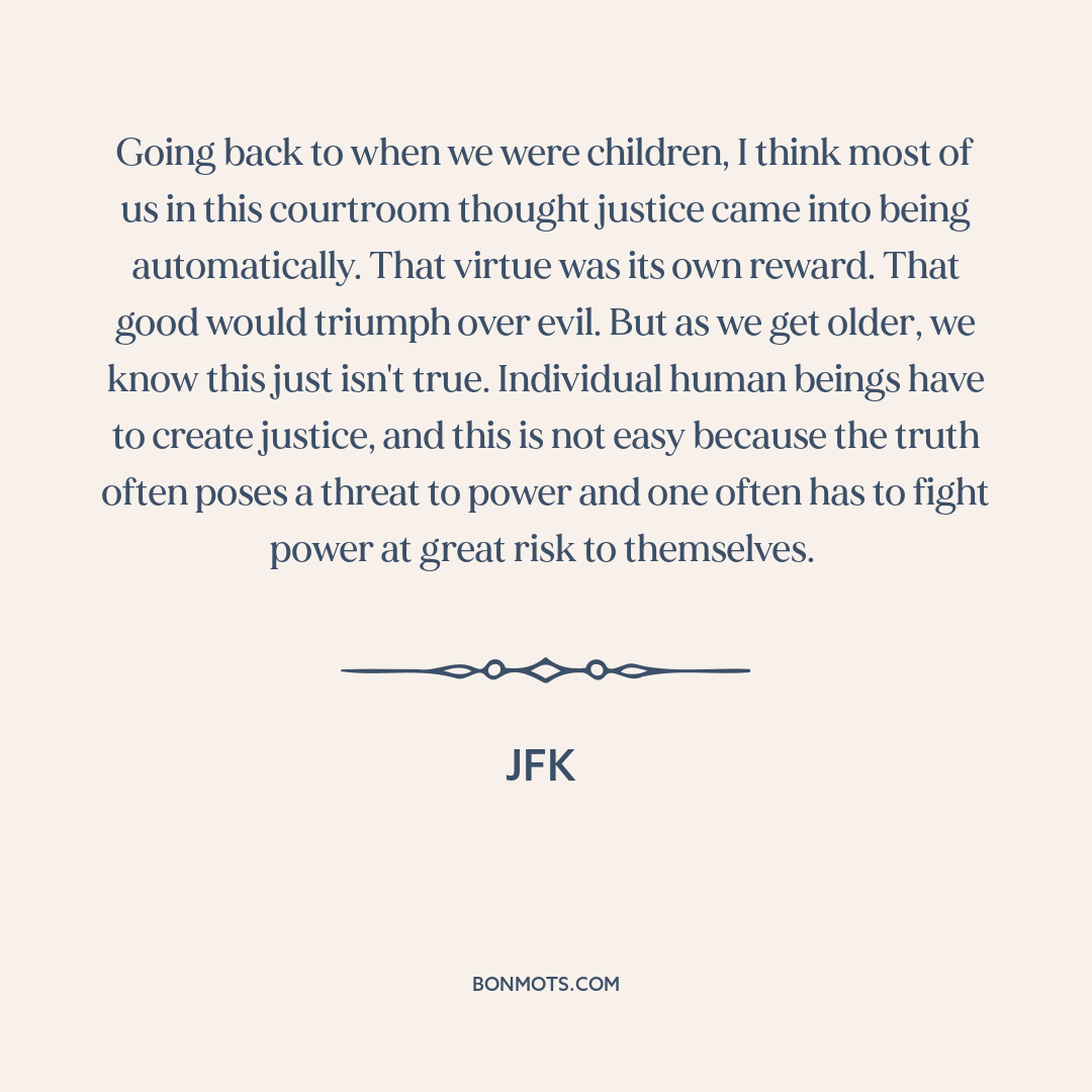 Going back to when we were children, I think most of us in this courtroom thought justice came into being automatically. That virtue was its own reward. That good would triumph over evil. But as we get older, we know this just isn't true. Individual human beings have to create justice, and this is not easy because the truth often poses a threat to power and one often has to fight power at great risk to themselves.