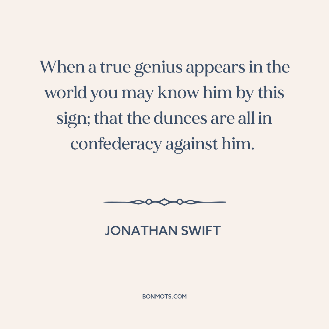 When a true genius appears in the world you may know him by this sign; that the dunces are all in confederacy against him.