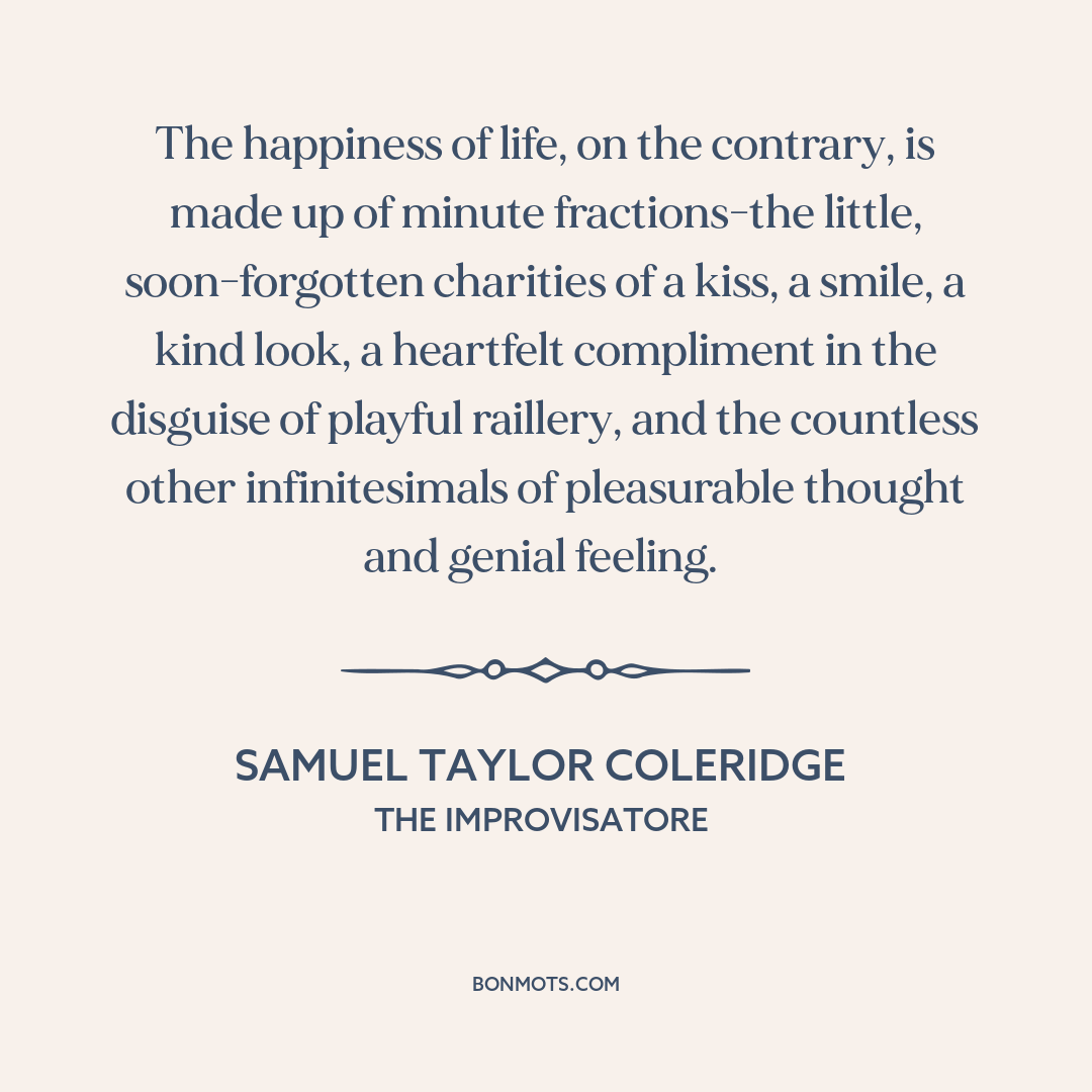 The happiness of life, on the contrary, is made up of minute fractions-the little, soon-forgotten charities of a kiss, a smile, a kind look, a heartfelt compliment in the disguise of playful raillery, and the countless other infinitesimals of pleasurable thought and genial feeling.