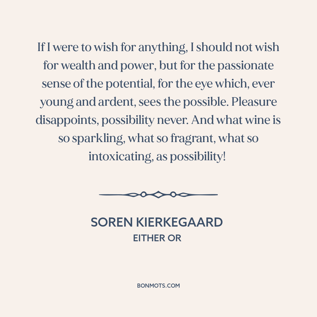 If I were to wish for anything, I should not wish for wealth and power, but for the passionate sense of the potential, for the eye which, ever young and ardent, sees the possible. Pleasure disappoints, possibility never. And what wine is so sparkling, what so fragrant, what so intoxicating, as possibility!