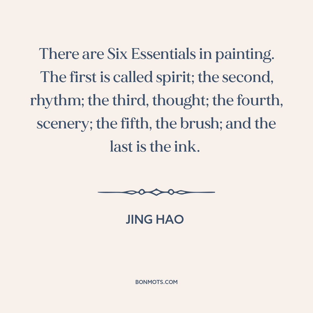 There are Six Essentials in painting. The first is called spirit; the second, rhythm; the third, thought; the fourth, scenery; the fifth, the brush; and the last is the ink.