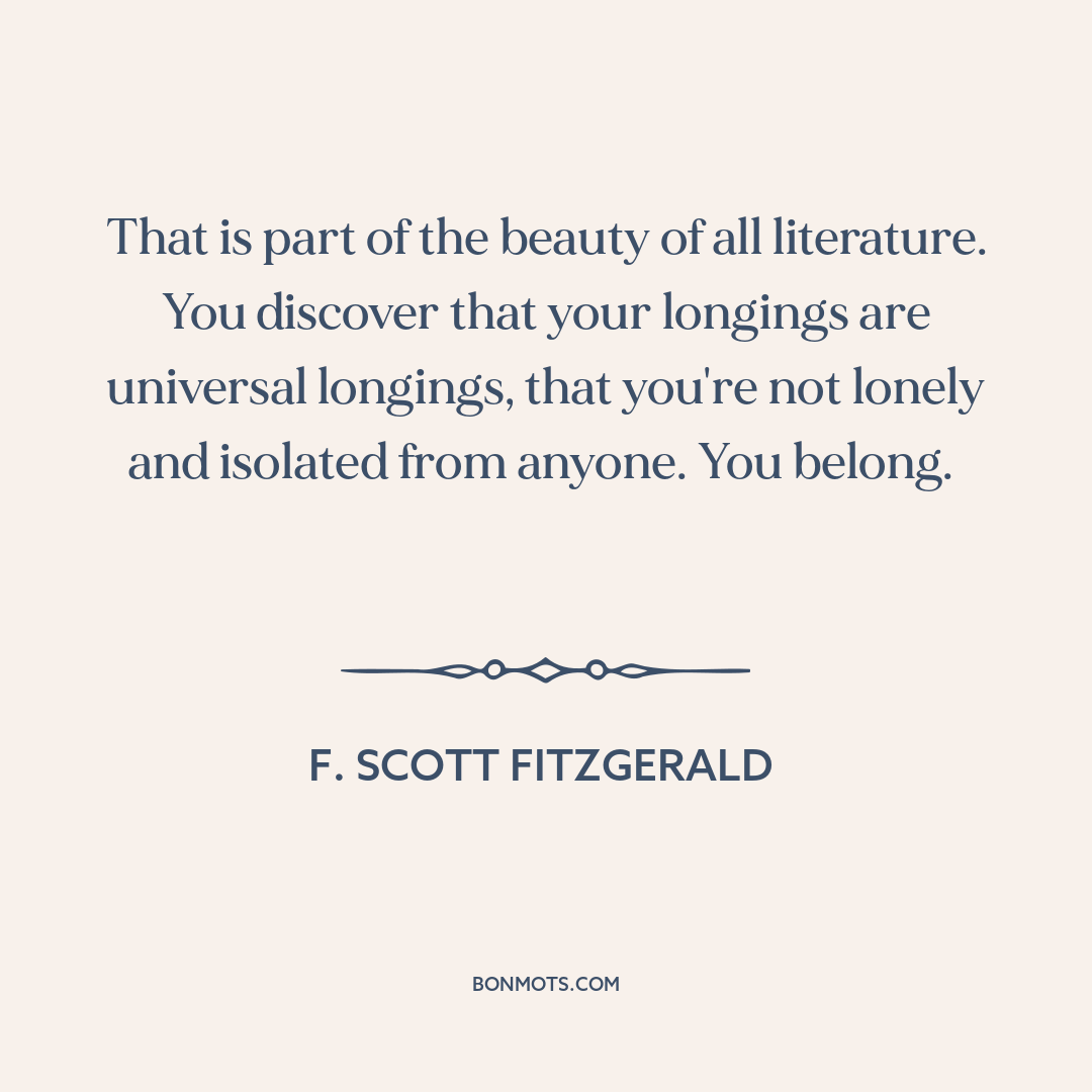 That is part of the beauty of all literature. You discover that your longings are universal longings, that you're not lonely and isolated from anyone. You belong.