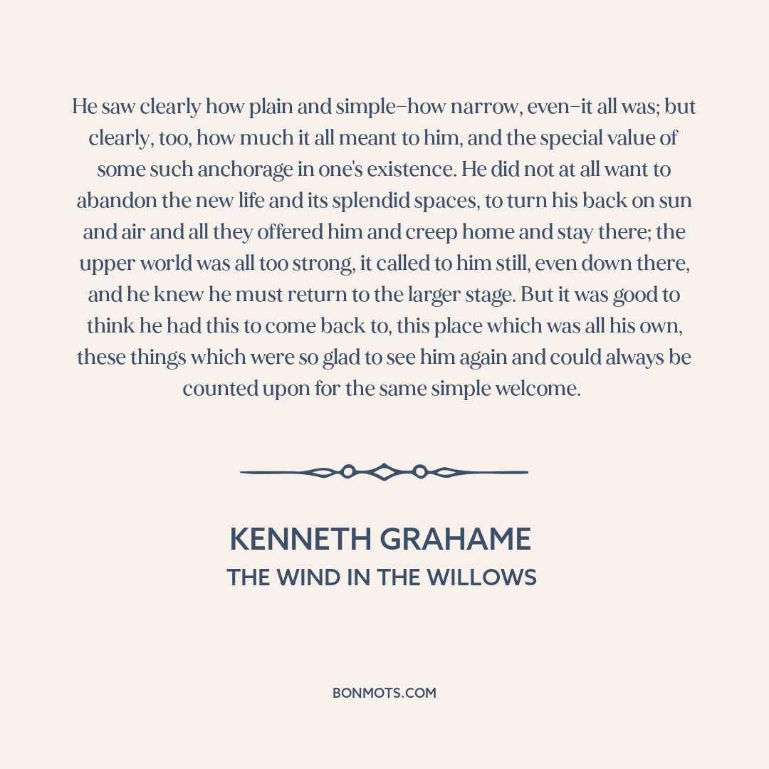 He saw clearly how plain and simple—how narrow, even—it all was; but clearly, too, how much it all meant to him, and the special value of some such anchorage in one's existence. He did not at all want to abandon the new life and its splendid spaces, to turn his back on sun and air and all they offered him and creep home and stay there; the upper world was all too strong, it called to him still, even down there, and he knew he must return to the larger stage. But it was good to think he had this to come back to, this place which was all his own, these things which were so glad to see him again and could always be counted upon for the same simple welcome.