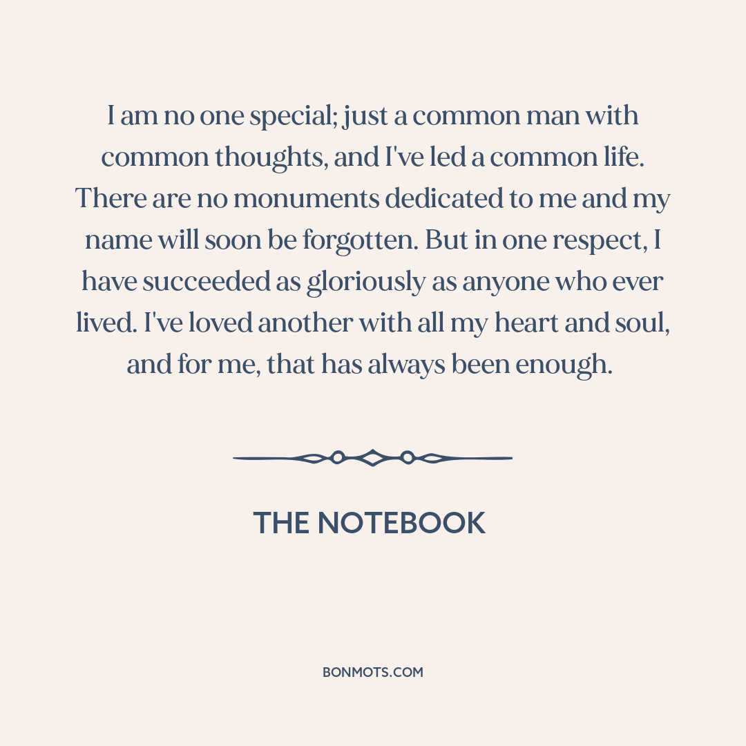 I am no one special; just a common man with common thoughts, and I've led a common life. There are no monuments dedicated to me and my name will soon be forgotten. But in one respect, I have succeeded as gloriously as anyone who ever lived. I've loved another with all my heart and soul, and for me, that has always been enough.