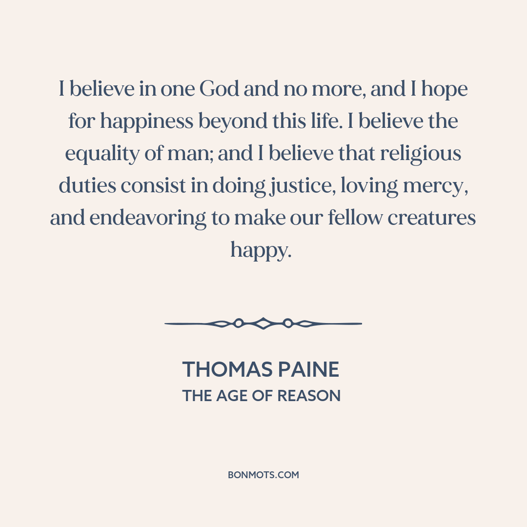 I believe in one God and no more, and I hope for happiness beyond this life. I believe the equality of man; and I believe that religious duties consist in doing justice, loving mercy, and endeavoring to make our fellow creatures happy.