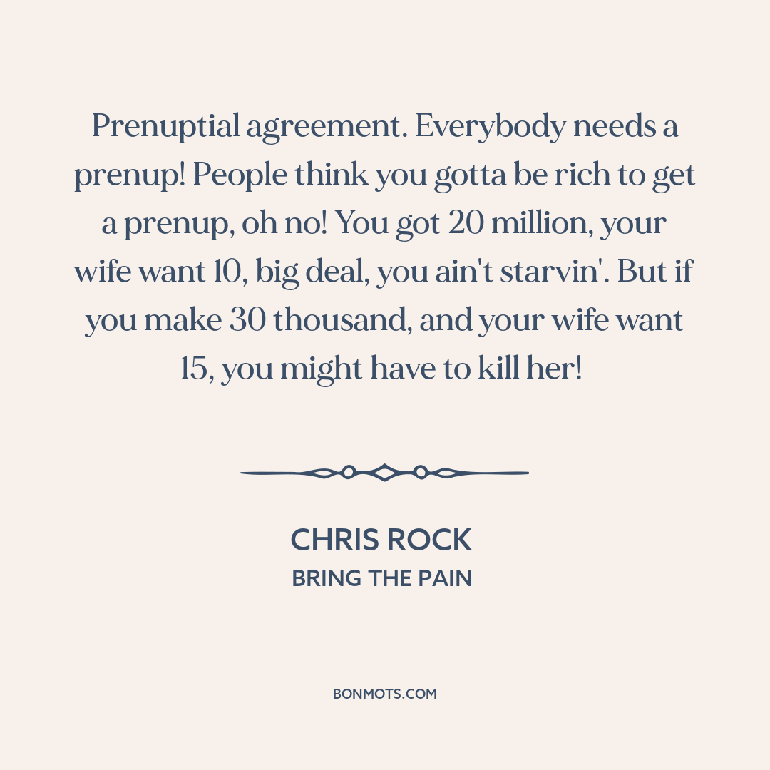 Prenuptial agreement. Everybody needs a prenup! People think you gotta be rich to get a prenup, oh no! You got 20 million, your wife want 10, big deal, you ain't starvin'. But if you make 30 thousand, and your wife want 15, you might have to kill her!