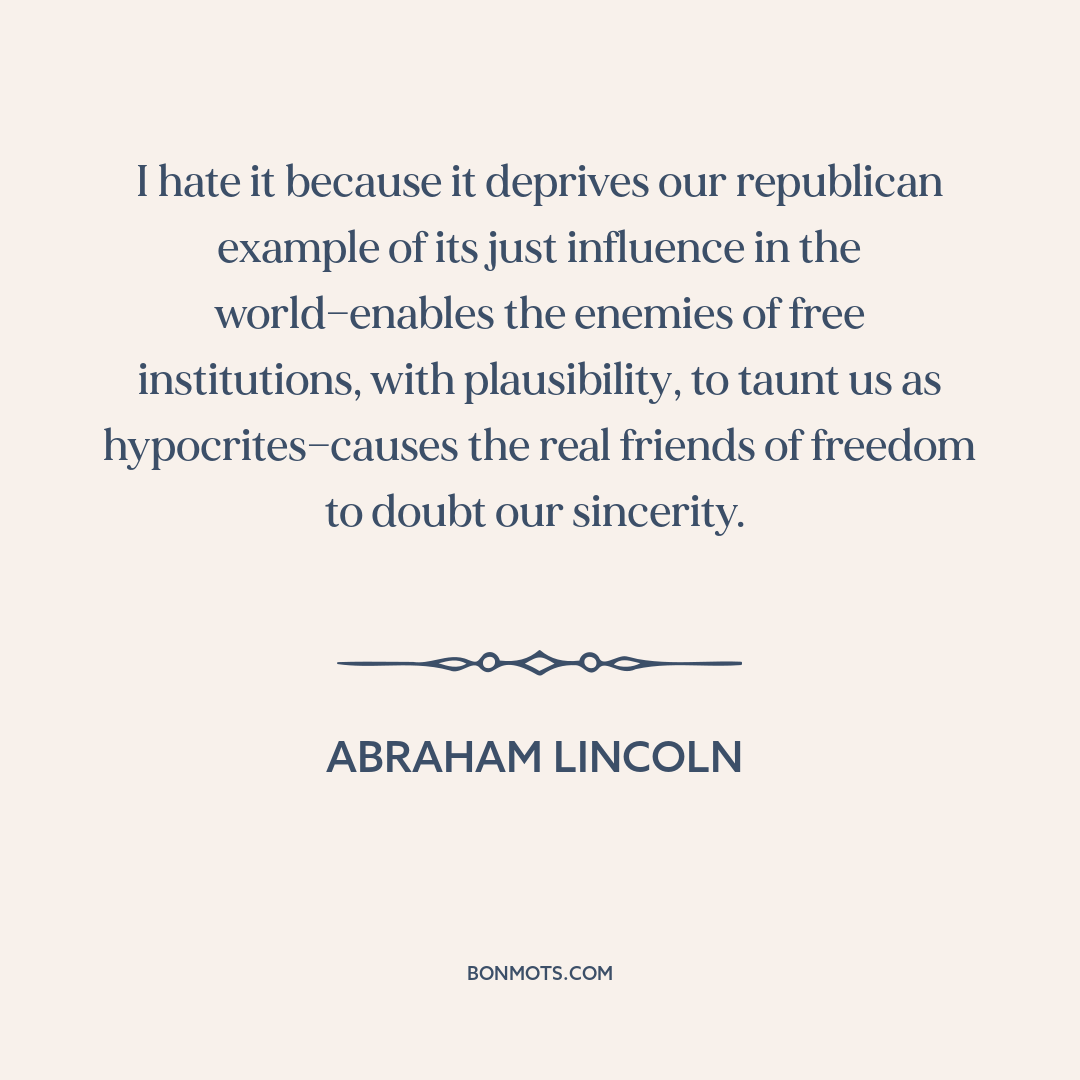 I hate it because it deprives our republican example of its just influence in the world—enables the enemies of free institutions, with plausibility, to taunt us as hypocrites—causes the real friends of freedom to doubt our sincerity.