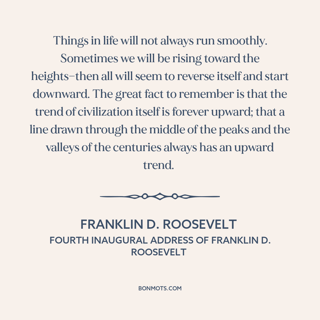 Things in life will not always run smoothly. Sometimes we will be rising toward the heights—then all will seem to reverse itself and start downward. The great fact to remember is that the trend of civilization itself is forever upward; that a line drawn through the middle of the peaks and the valleys of the centuries always has an upward trend.